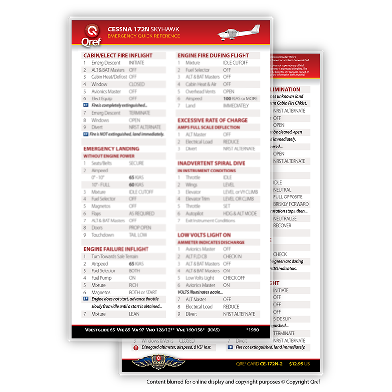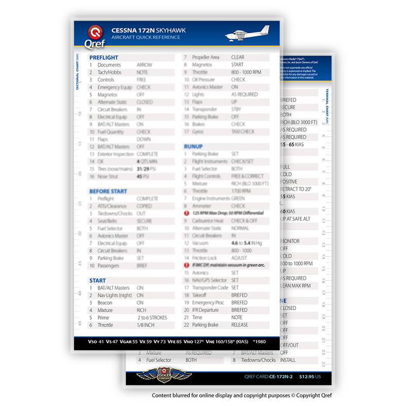 Qref BooksTopics Covered: Preflight, Takeoff/Cruise, Landing, Comprehensive Abnormals and Emergencies, V-speed list, cruise performance chart Get the most accurate, reliable aircraft checklist on the market with a Qref checklist. The procedures cover every aspect of flight, from preflight through takeoff, cruise, landing, and a comprehensive emergencies/abnormals section. Emergencies are arranged by system, meaning no more digging through pages to find the right section. Qref’s trademark is creating checklists that are easy for pilots to use. A major difference in aircraft checklists between Qref and others is the level of experience and expertise that go into every procedure. The Qref team of Master CFIs have over four decades of combined active flight instruction and flying experience at all levels of industry, with instruction and flight time in this aircraft. Further, they have taken advantage of the past 20 years of checklist design research. Qref’s team incorporates industry-best practices into these checklists and forthcoming publications. They not only create checklists, they use them in daily instruction and flying. Qref checklist design features a larger, more readable font, comprehensive procedures sectioned into tabs loaded with useful reference and conversions, and non-glare laminated pages. A complete table of contents makes finding the exact procedure quick. Find out for yourself why Qref aircraft checklists are fast becoming the Gold Standard in aviation. Qref CardsTopics Covered: Preflight, Takeoff/Cruise, Landing, Abnormals and Emergencies, V-speed list 2-card set: one for standard procedures, one for abnormals and emergencies. Q'Cards are designed for pilots who are already familiar with the aircraft but need an everyday checklist to keep relevant procedures at their fingertips. 5" x 9" (12.7 cm x 22.8 cm), the prefect size to fit on a yoke mount or kneeboard. Indestructible proprietary 10-mil laminate with non-glare, UV protective treatment means these checklists will withstand years of use. No other checklist has this! A major difference in aircraft checklists between Qref and others is the level of experience and expertise that go into every procedure. The Qref team of Master CFIs have over four decades of combined active flight instruction and flying experience at all levels of industry, with instruction and flight time in this aircraft. Further, they have taken advantage of the past 20 years of checklist design research. Qref’s team incorporates industry-best practices into these checklists and forthcoming publications. They not only create checklists, they use them in daily instruction and flying. Find out for yourself why Qref aircraft checklists are fast becoming the Gold Standard in aviation. |