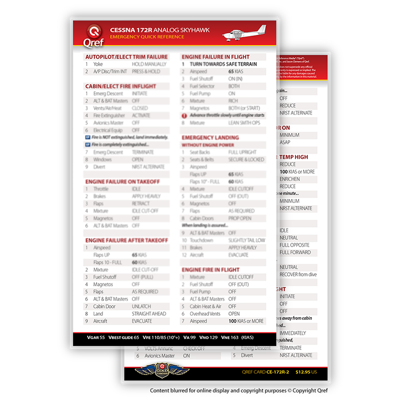 Qref BooksTopics Covered: Preflight, Takeoff/Cruise, Landing, Comprehensive Abnormals and Emergencies, V-speed list, cruise performance chart Get the most accurate, reliable aircraft checklist on the market with a Qref checklist. The procedures cover every aspect of flight, from preflight through takeoff, cruise, landing, and a comprehensive emergencies/abnormals section. Emergencies are arranged by system, meaning no more digging through pages to find the right section. Qref’s trademark is creating checklists that are easy for pilots to use. A major difference in aircraft checklists between Qref and others is the level of experience and expertise that go into every procedure. The Qref team of Master CFIs have over four decades of combined active flight instruction and flying experience at all levels of industry, with instruction and flight time in this aircraft. Further, they have taken advantage of the past 20 years of checklist design research. Qref’s team incorporates industry-best practices into these checklists and forthcoming publications. They not only create checklists, they use them in daily instruction and flying. Qref checklist design features a larger, more readable font, comprehensive procedures sectioned into tabs loaded with useful reference and conversions, and non-glare laminated pages. A complete table of contents makes finding the exact procedure quick. Find out for yourself why Qref aircraft checklists are fast becoming the Gold Standard in aviation. Qref CardsTopics Covered: Preflight, Takeoff/Cruise, Landing, Abnormals and Emergencies, V-speed list 2-card set: one for standard procedures, one for abnormals and emergencies. Q'Cards are designed for pilots who are already familiar with the aircraft but need an everyday checklist to keep relevant procedures at their fingertips. 5" x 9" (12.7 cm x 22.8 cm), the prefect size to fit on a yoke mount or kneeboard. Indestructible proprietary 10-mil laminate with non-glare, UV protective treatment means these checklists will withstand years of use. No other checklist has this! A major difference in aircraft checklists between Qref and others is the level of experience and expertise that go into every procedure. The Qref team of Master CFIs have over four decades of combined active flight instruction and flying experience at all levels of industry, with instruction and flight time in this aircraft. Further, they have taken advantage of the past 20 years of checklist design research. Qref’s team incorporates industry-best practices into these checklists and forthcoming publications. They not only create checklists, they use them in daily instruction and flying. Find out for yourself why Qref aircraft checklists are fast becoming the Gold Standard in aviation. |