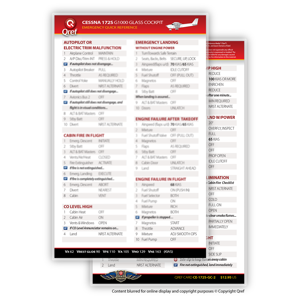 Qref BooksTopics Covered: Preflight, Takeoff/Cruise, Landing, Comprehensive Abnormals and Emergencies, V-speed list, cruise performance chart Get the most accurate, reliable aircraft checklist on the market with a Qref checklist. The procedures cover every aspect of flight, from preflight through takeoff, cruise, landing, and a comprehensive emergencies/abnormals section. Emergencies are arranged by system, meaning no more digging through pages to find the right section. Qref’s trademark is creating checklists that are easy for pilots to use. A major difference in aircraft checklists between Qref and others is the level of experience and expertise that go into every procedure. The Qref team of Master CFIs have over four decades of combined active flight instruction and flying experience at all levels of industry, with instruction and flight time in this aircraft. Further, they have taken advantage of the past 20 years of checklist design research. Qref’s team incorporates industry-best practices into these checklists and forthcoming publications. They not only create checklists, they use them in daily instruction and flying. Qref checklist design features a larger, more readable font, comprehensive procedures sectioned into tabs loaded with useful reference and conversions, and non-glare laminated pages. A complete table of contents makes finding the exact procedure quick. Find out for yourself why Qref aircraft checklists are fast becoming the Gold Standard in aviation. Qref CardsTopics Covered: Preflight, Takeoff/Cruise, Landing, Abnormals and Emergencies, V-speed list 2-card set: one for standard procedures, one for abnormals and emergencies. Q'Cards are designed for pilots who are already familiar with the aircraft but need an everyday checklist to keep relevant procedures at their fingertips. 5" x 9" (12.7 cm x 22.8 cm), the prefect size to fit on a yoke mount or kneeboard. Indestructible proprietary 10-mil laminate with non-glare, UV protective treatment means these checklists will withstand years of use. No other checklist has this! A major difference in aircraft checklists between Qref and others is the level of experience and expertise that go into every procedure. The Qref team of Master CFIs have over four decades of combined active flight instruction and flying experience at all levels of industry, with instruction and flight time in this aircraft. Further, they have taken advantage of the past 20 years of checklist design research. Qref’s team incorporates industry-best practices into these checklists and forthcoming publications. They not only create checklists, they use them in daily instruction and flying. Find out for yourself why Qref aircraft checklists are fast becoming the Gold Standard in aviation. |
