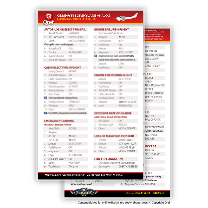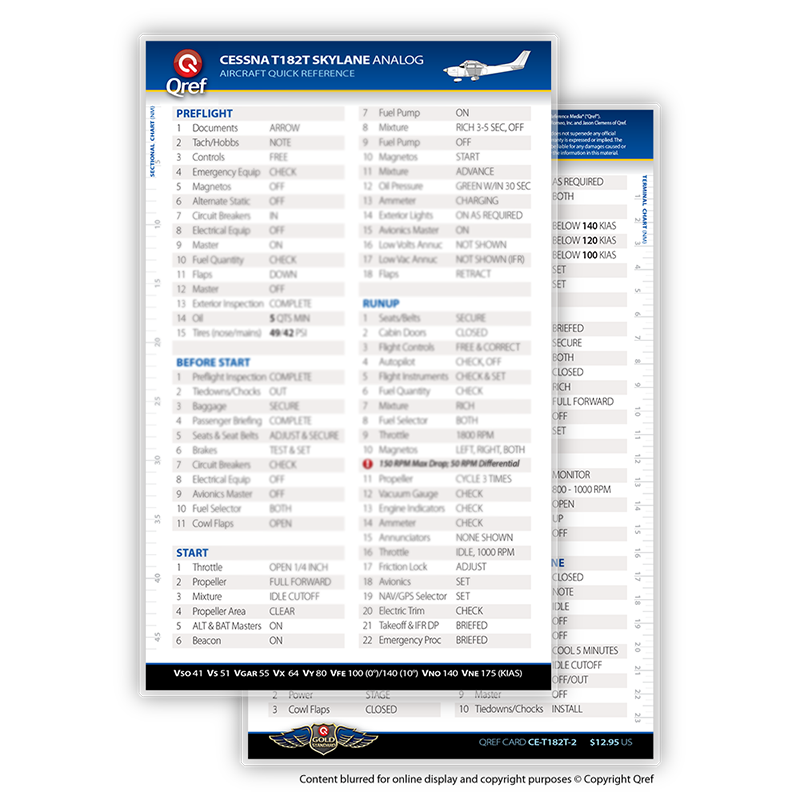 Qref BooksTopics Covered: Preflight, Takeoff/Cruise, Landing, Comprehensive Abnormals and Emergencies, V-speed list, cruise performance chart Get the most accurate, reliable aircraft checklist on the market with a Qref checklist. The procedures cover every aspect of flight, from preflight through takeoff, cruise, landing, and a comprehensive emergencies/abnormals section. Emergencies are arranged by system, meaning no more digging through pages to find the right section. Qref’s trademark is creating checklists that are easy for pilots to use. A major difference in aircraft checklists between Qref and others is the level of experience and expertise that go into every procedure. The Qref team of Master CFIs have over four decades of combined active flight instruction and flying experience at all levels of industry, with instruction and flight time in this aircraft. Further, they have taken advantage of the past 20 years of checklist design research. Qref’s team incorporates industry-best practices into these checklists and forthcoming publications. They not only create checklists, they use them in daily instruction and flying. Qref checklist design features a larger, more readable font, comprehensive procedures sectioned into tabs loaded with useful reference and conversions, and non-glare laminated pages. A complete table of contents makes finding the exact procedure quick. Find out for yourself why Qref aircraft checklists are fast becoming the Gold Standard in aviation. Qref CardsTopics Covered: Preflight, Takeoff/Cruise, Landing, Abnormals and Emergencies, V-speed list 2-card set: one for standard procedures, one for abnormals and emergencies. Q'Cards are designed for pilots who are already familiar with the aircraft but need an everyday checklist to keep relevant procedures at their fingertips. 5" x 9" (12.7 cm x 22.8 cm), the prefect size to fit on a yoke mount or kneeboard. Indestructible proprietary 10-mil laminate with non-glare, UV protective treatment means these checklists will withstand years of use. No other checklist has this! A major difference in aircraft checklists between Qref and others is the level of experience and expertise that go into every procedure. The Qref team of Master CFIs have over four decades of combined active flight instruction and flying experience at all levels of industry, with instruction and flight time in this aircraft. Further, they have taken advantage of the past 20 years of checklist design research. Qref’s team incorporates industry-best practices into these checklists and forthcoming publications. They not only create checklists, they use them in daily instruction and flying. Find out for yourself why Qref aircraft checklists are fast becoming the Gold Standard in aviation. |