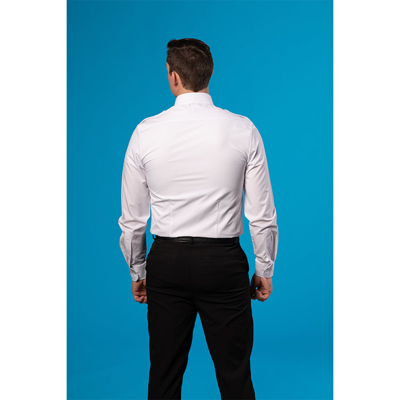 The best shirt in the skies. 3D stretch, ultra-breathable, buttery soft, stain-repellent, moisture wicking, made of recycled materials, machine washable, wrinkle-resistant.