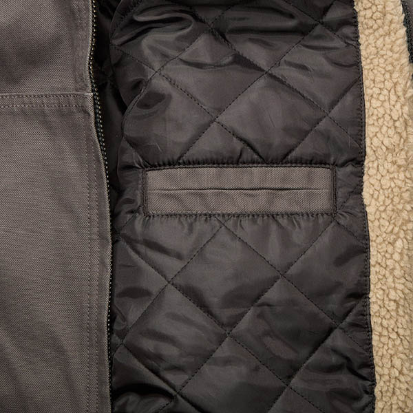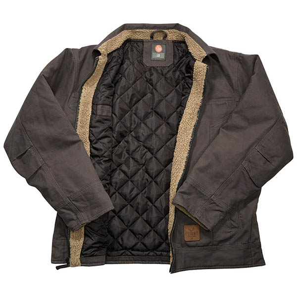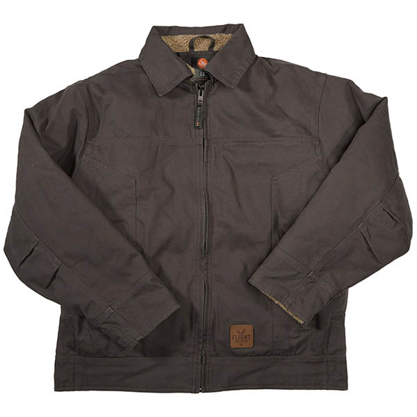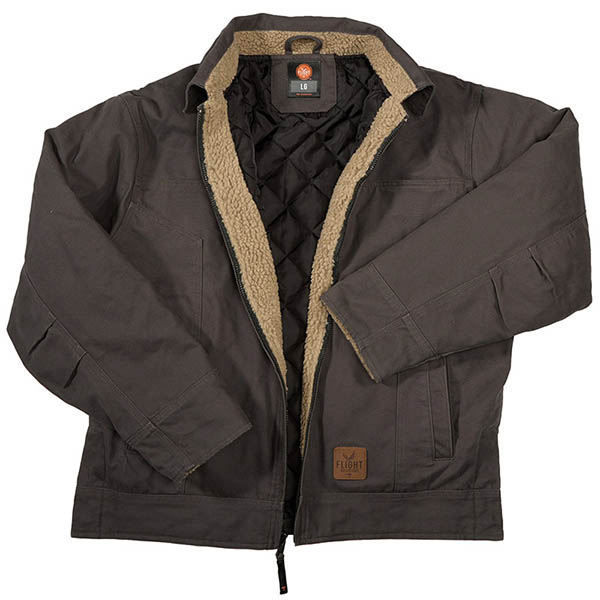 Bi-swing back, heavy canvas, hand warmer pockets, inside chest pocket w/velcro tab closure, outside chest pocket with metal zipper, snaps on bottom on each side and a quilted lining. Wow! This runs true to size, and more information is available on Flight Outfitters website.