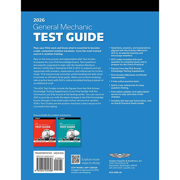 Pass your test and know what is essential to become a safe, competent aviation mechanic—from the most trusted source in aviation training. Rely on the time-proven and dependable ASA Test Guides to prepare for your FAA Knowledge Exams. Test questions are expertly organized to align with the Aviation Mechanic Airman Certification Standards (FAA-S-ACS-1) subjects and are supported with answers, explanations, and references for further study. This topical study promotes understanding and aids recall to provide an efficient study guide. When you’re done studying, take practice tests with ASA’s online simulated testing program at no additional cost! The ASA Test Guides include the figures from the FAA Airman Knowledge Testing Supplement so you’ll be familiar with the information you’ll be issued at the testing center. You can count on ASA to provide you with the latest changes in the FAA Knowledge Exams through a free email subscription service and updates. ASA’s Test Guides are the aviation mechanic’s best resource for successful test-taking.