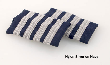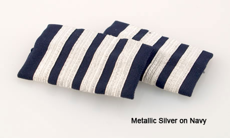 The board for these epaulets are made of 100% Polyester and the finest braided bars available. Epaulets are available with a Black or Navy base and Metallic Gold, Metallic Silver, Nylon Gold, Nylon Silver, or Nylon White stripes. Price per pair. Measure approximately 3" x 2 1/4" with a 1/4" taper. Sold in pairs and hand made in the USA! |