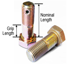 Hex head aircraft bolts are made of high-strength type 4037 or 8740 alloy steel (type 8740 is most commonly used). The bolts are centerless ground and threaded after heat treatment. Minimum tensile strength 125,000 PSI. Cadmium plated per specification QQ-P-416A, Type II, Class 3. Available with shank drilled for cotter pin or undrilled for stop nut application, and with or without drilled head for safety wire. Specify bolts to have undrilled shank by adding letter "A" after the dash number. For bolts with drilled head add letter "H" after the AN number. See illustrated examples. "C" represents Type 431 Stainless Steel (contains iron which is magnetic). The length of AN aircraft bolts is measured from under the head to the end of the shank. The "grip" is the unthreaded portion of the shank. See table for conversion of length and/or grip to proper AN callout.
