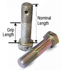| Hex head aircraft bolts are made of high-strength type 4037 or 8740 alloy steel (type 8740 is most commonly used). The bolts are centerless ground and threaded after heat treatment. Minimum tensile strength 125,000 PSI. Cadmium plated per specification QQ-P-416A, Type II, Class 3. Available with shank drilled for cotter pin or undrilled for stop nut application, and with or without drilled head for safety wire. Specify bolts to have undrilled shank by adding letter "A" after the dash number. For bolts with drilled head add letter "H" after the AN number. See illustrated examples. "C" represents Type 431 Stainless Steel (contains iron which is magnetic). The length of AN aircraft bolts is measured from under the head to the end of the shank. The "grip" is the unthreaded portion of the shank. See table for conversion of length and/or grip to proper AN callout. Note: Drilled bolts listed above are drilled shank only. To order drilled head only or both drilled head and shank bolts, please use our AN Bolt Selector by clicking the link below. Click here for the AN Bolt Selector |