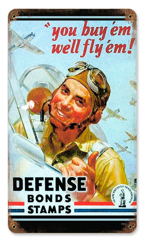 | This Defense Bond Stamps vintage metal sign measures approximately 8-inches by 14-inches.. Unlike most tin signs, these are designed and made in the United States using 24 gauge American steel and a process known as sublimation, where the image is baked into a powder coating for a durable and long lasting finish. This sign is drilled and riveted for easy hanging. |