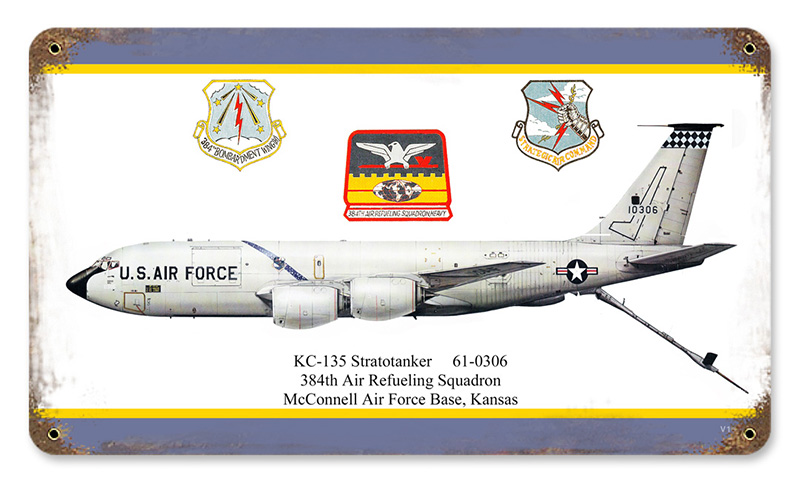 This KC-135 Stratotanker vintage metal sign measures approximately 14-inches by 8-inches. Unlike most tin signs, they design and make their signs in the United States using 24 gauge American steel and a process known as sublimation, where the image is baked into a powder coating for a durable and long lasting finish. This sign is drilled and riveted for easy hanging. |