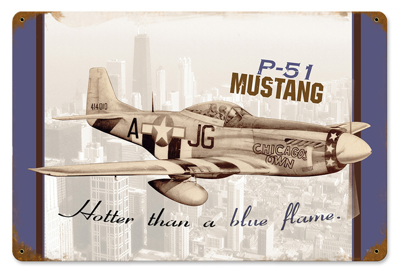 | This P-51 Chicago vintage metal sign measures approximately 18-inches by 12-inches. Unlike most tin signs, they design and make their signs in the United States using 24 gauge American steel and a process known as sublimation, where the image is baked into a powder coating for a durable and long lasting finish. This sign is drilled and riveted for easy hanging. |