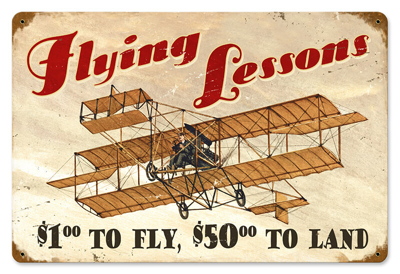 | This Flying Lessons vintage metal sign measures approximately 18-inches by 12-inches.Unlike most tin signs, they design and make their signs in the United States using 24 gauge American steel and a process known as sublimation, where the image is baked into a powder coating for a durable and long lasting finish. This sign is drilled and riveted for easy hanging. |