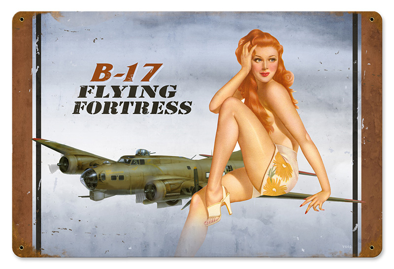 | This B-17 redhead vintage metal sign measures approximately 18-inches by 12-inches. Unlike most tin signs, they design and make their signs in the United States using 24 gauge American steel and a process known as sublimation, where the image is baked into a powder coating for a durable and long lasting finish. This sign is drilled and riveted for easy hanging. |