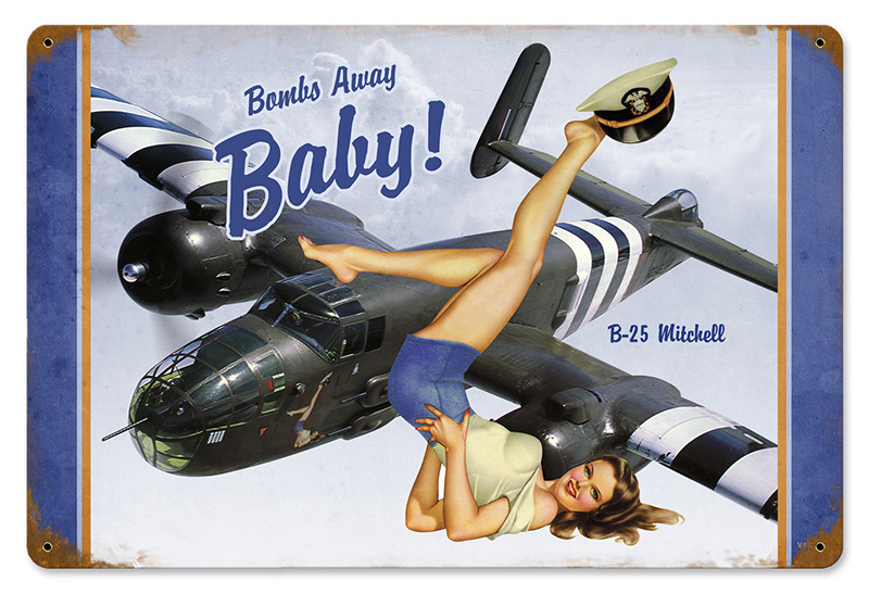 | This Bombs Away vintage metal sign measures approximately 18-inches by 12-inches. Unlike most tin signs, they design and make their signs in the United States using 24 gauge American steel and a process known as sublimation, where the image is baked into a powder coating for a durable and long lasting finish. This sign is drilled and riveted for easy hanging. |