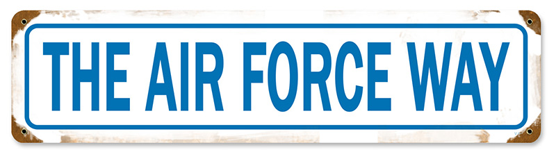 | This The Air Force Way vintage metal sign measures approximately 20-inches by 5-inches. Unlike most tin signs, they design and make their signs in the United States using 24 gauge American steel and a process known as sublimation, where the image is baked into a powder coating for a durable and long lasting finish. This sign is drilled and riveted for easy hanging. |