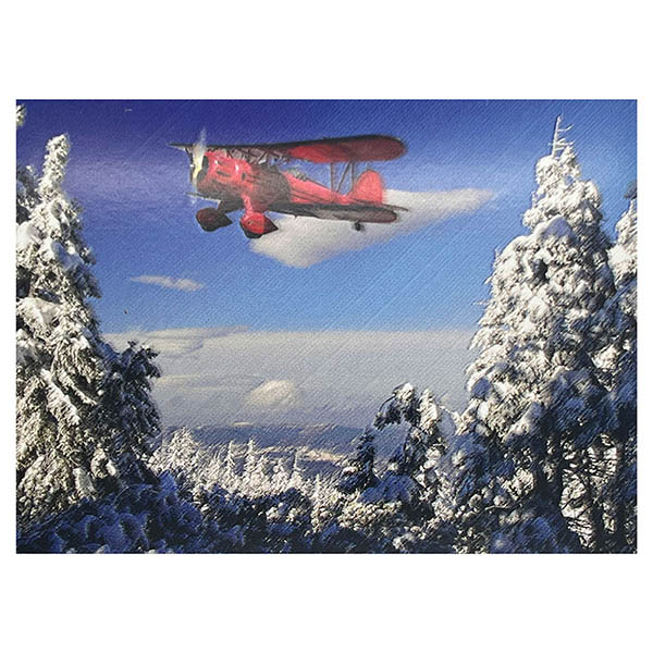 Red Biplane Over Snowy Pines. Designed to resemble a painting with faux canvas appearance.