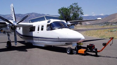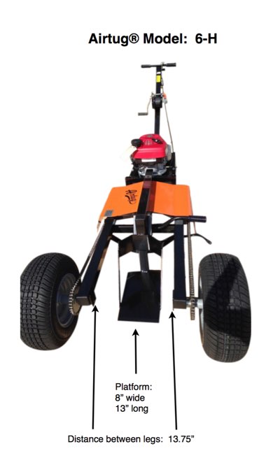 | The 6-H model AirTug® is the tug of choice for those who need to lower the tail to enter a hangar or are working with a lip 3/4″ or greater. The nose-wheel is loaded onto a platform which can then be raised by a hydraulic jack up as much as needed to a maximum of roughly 7”, thus lowering the tail by approximately double this amount. Additionally, it is easy to use because of its’ unique “Twist Grip Control” system utilizing a hydrostatic transmission and a 6 HP fixed speed gasoline engine. We ensure your safety with our “Return to Brake” feature that prevents any unintentional movement of the plane when the twist grip is released. There is no metal to metal contact, no gears to shift and no jerky clutching systems to quickly wear out. Finally, its’ pinpoint handling allows the operator to pivot as tight as desired as a result of the differential transmission. All of these features simply make this aircraft tug the best in the industry! |