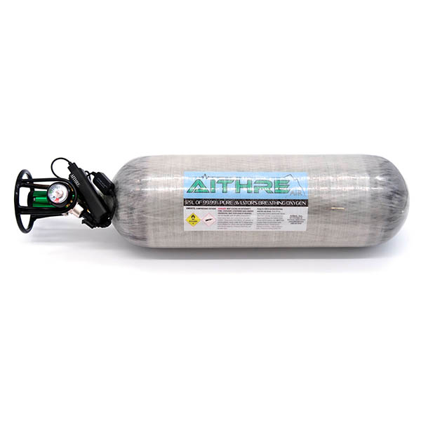 The Aithre personal oxygen bottle is constructed from lightweight composite carbon fiber with an aluminum lining and is designed for private aviation. Offering a 2000 PSI working pressure, simple on-off gauge, and an adjustable flow regulator, this bottle is ideal for pilots in private GA aircraft with flow rates as high as 25LPM.