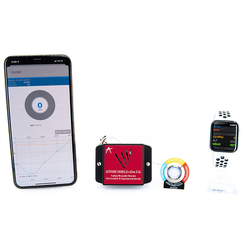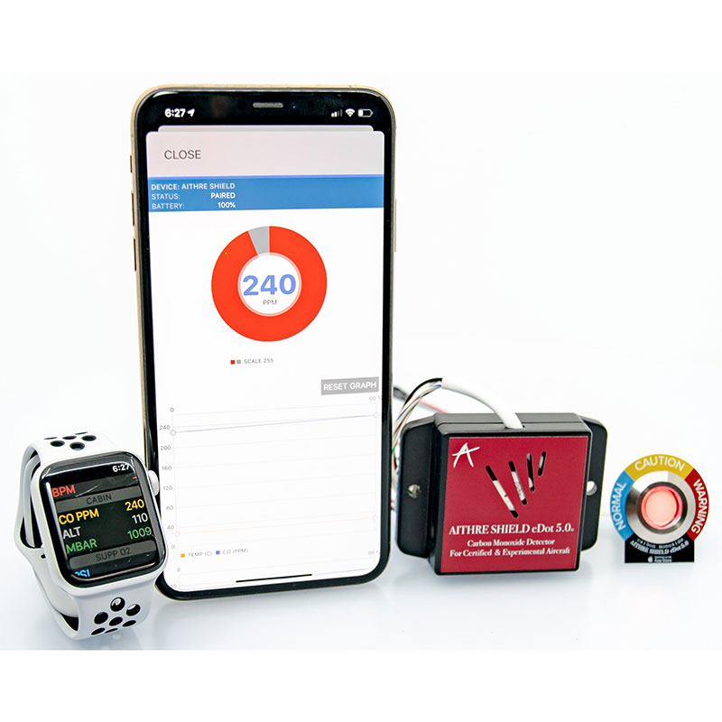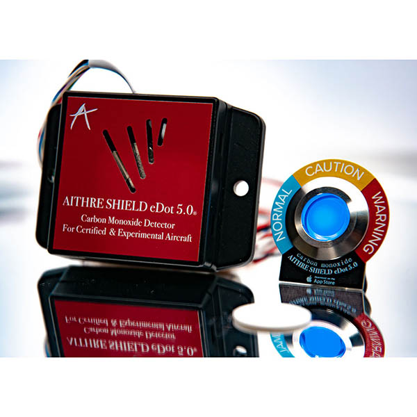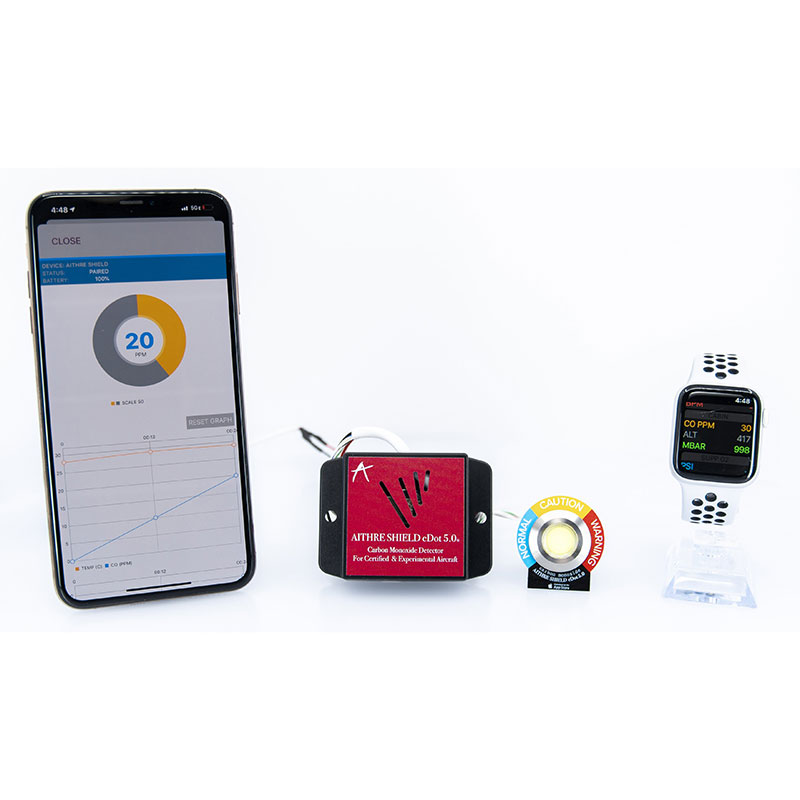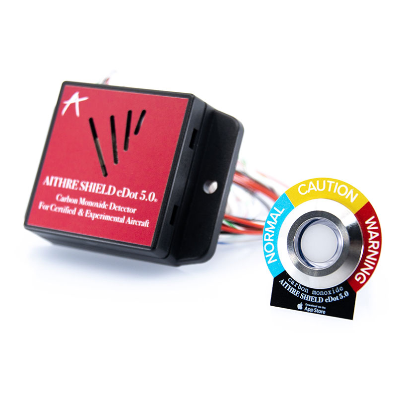 The Aithre Shield 5.0 eDot CO Detector - FAA Part 23 Approved - Panel Led Indicator with iOS App. FAA approved for Certified Aircraft but also available for experimental Aircraft builders: The Aithre Shield eDot 5.0 is the first behind-the-panel device that puts carbon monoxide readings output to panel mounted LED light and to iOS device.
