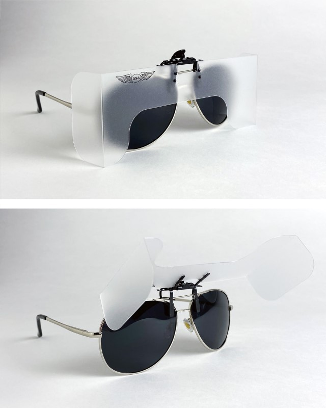 Overcasters® are a lightweight, simple, and effective view-limiting instrument training device for pilots. With a frosted, clip-on visor that attaches to a prescription eyeglass or sunglass frame in seconds, Overcasters eliminate the discomfort of straps, helmets, or hoods. When flipped down, Overcasters provide near perfect simulated instrument conditions, and when flipped up, the device serves to mimic “instrument-to-visual” transition.