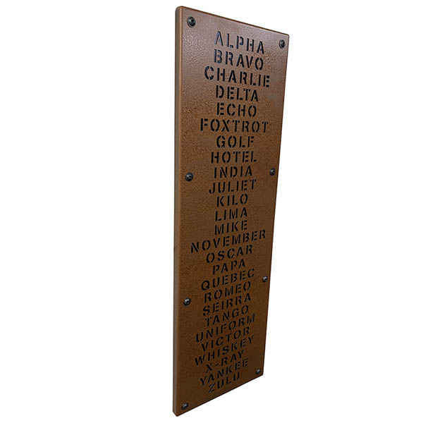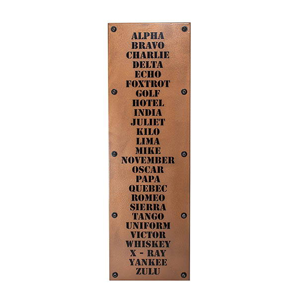 | Aviator Phonetic Sign is made from steel with a hammered copper paint finish. |