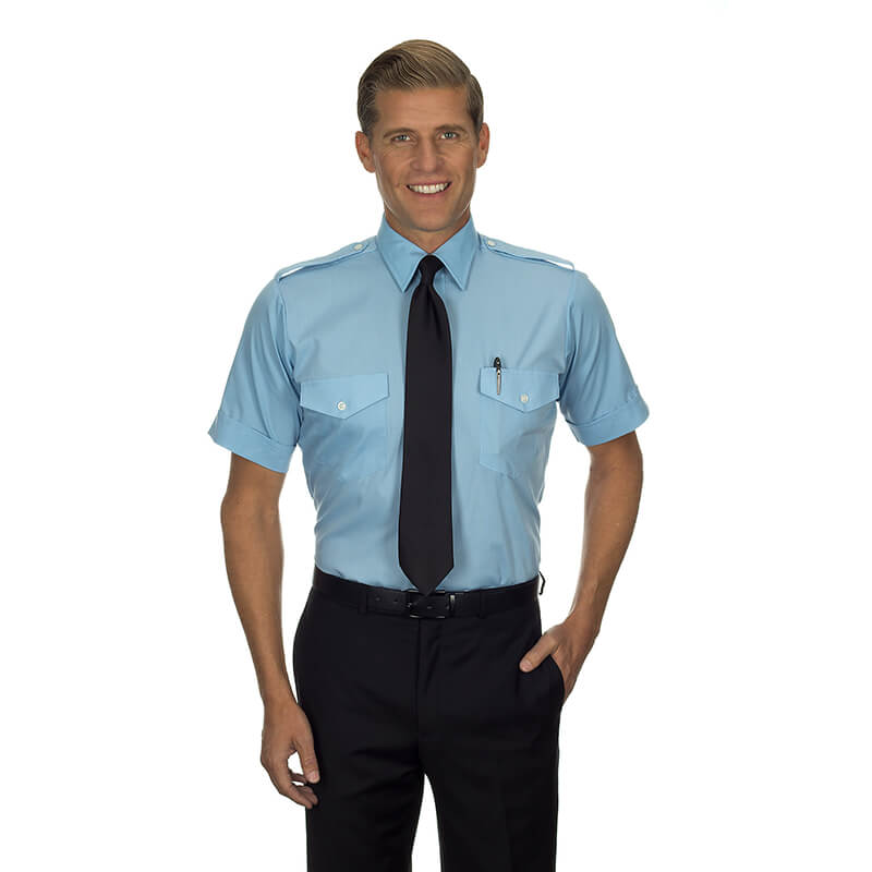 The authentic airline pilot shirt worn by more commercial pilots than any other. Manufactured in military weight poplin, wrinkled resitant 65% polyester, 35% combed cotton, epaulets, two flap pockets, pencil slot, longer tuck in tails, double button adjustable cuffs.