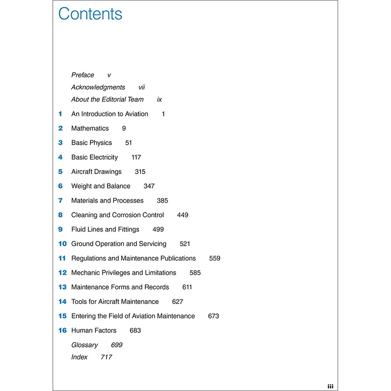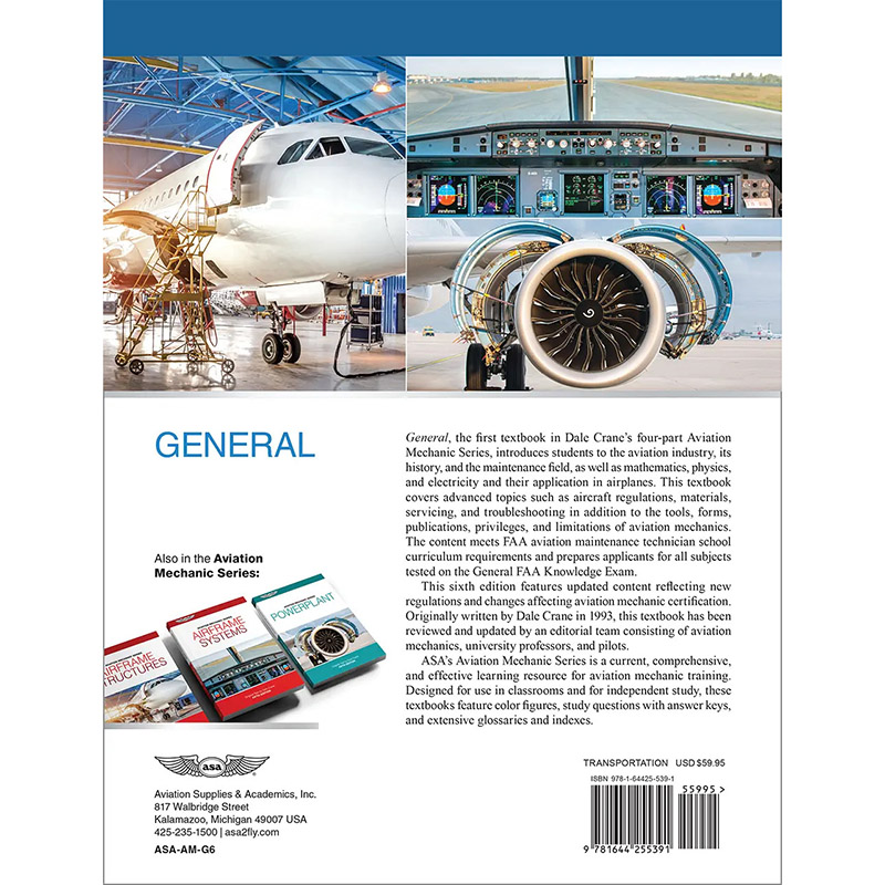 General, the first textbook in Dale Crane’s four-part Aviation Mechanic Series, introduces students to the aviation industry, its history, and the maintenance field, as well as mathematics, physics, and electricity and their application in airplanes. This textbook covers advanced topics such as aircraft regulations, materials, servicing, and troubleshooting in addition to the tools, forms, publications, privileges, and limitations of aviation mechanics. The content meets FAA aviation maintenance technician school curriculum requirements and prepares applicants for all subjects on the General FAA Knowledge Test. This sixth edition features updated content reflecting new regulations and changes affecting aviation mechanic certification. Originally written by Dale Crane in 1993, this textbook has been reviewed and updated by an editorial team consisting of aviation mechanics, university professors, and pilots. ASA’s Aviation Mechanic Series is a current, comprehensive, and effective learning resource for aviation mechanic training. Designed for use in classrooms and for independent study, these textbooks feature color figures, study questions with answer keys, and extensive glossaries and indexes. |