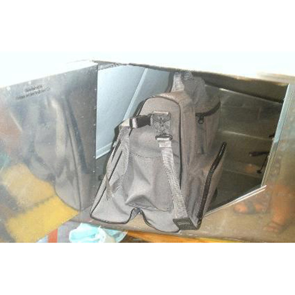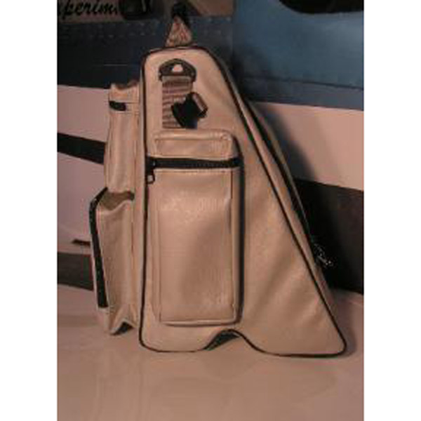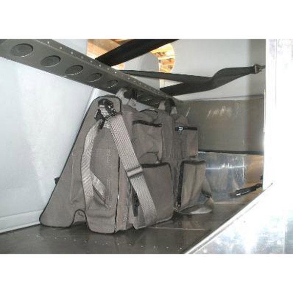 A practical solution to organizing the cargo area of your RV-6, RV-7 or RV-9. Also makes a great overnight bag! Our RV Flight Bag was designed to fit behind the pilots and co-pilots seat of the RV-6/7/9. It fits over the flap actuator bar and makes maximum use of the area behind your seat. This keeps the CG as far forward as possible and maximizes remaining cargo space. The RV Flight Bag is 18 inches high and 12.5 inches wide. It has a very large main cargo area easily accessible with a large zipper flap. There are two side pockets, one 10" x 4 " and a 7" x 5.5” map pocket. The rear side of the bag has a pencil /flashlight/fuel tester pocket, a 10 inch x 7 inch headset pocket, and a 6”x 5 ¼” pocket for small tools. The material and zippers are heavy duty and will last a long time.The bag is made of durable Curdura and is resistant to liquids. It has a nice carrying handle and comes with two straps that can be attached to your seat back to clip the bag to your seat to minimize movement. It also comes with a removable shoulder strap. |