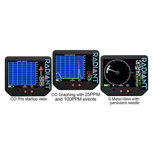**NOT FAA APPROVED - FOR USE IN EXPERIMENTAL AIRCRAFT ONLY**CO Pro™is a new generation product in Radiant Technology’s robust line of avionic and sensor tech instruments. CO Pro™ is a Carbon Monoxide detector and G-Meter all in one. Designed for pilots and aviation enthusiasts, the portable detector features two primary interfaces¬–one with continuous CO graphing capability and the other showing a G Meter (which also shows CO levels in background). The G Meter needle has a persistence feature as well, showing the range of G values the unit has experienced. The unit has an audible alarm and is battery powered up to five hours on a single charge (rechargeable with USB) and over 10 hours when the screen is dimmed. CO Pro™ updates Radiant’s carbon monoxide safety product line with brilliant new features. The ability to see CO levels trend over time provides better information than old fashioned, static display digital monitors. This increases pilot and passenger comfort and also helps to determine what might have happened. For instance, a change in engine noise associated with an observable graph rise in CO levels might be associated with a new crack in an exhaust system. See the Changes in CO Level The seminal feature of CO Pro™ is the Carbon Monoxide graphing feature which allows pilots to see the current CO level, all calibrated and displayed in accordance with FAA recommendations. As a result, any change in CO level is seen as a change on the graph along with a change in the digital value of CO. A flashing trend alert arrow, an aural alarm which triggers at 41 PPM, and danger icon that turns red at 100 PPM, completes the set of CO indications (graph showing history of CO levels, digital CO value, warning indicators, and aural alarm). The FAA recommends a yellow alert at 21PPM, and a red alert at 41PPM. This product is engineered to match those values with color indications on the graph and in the digital values. A G-Meter is also included which shows up to +/- 6 g’s in a familiar dial format, along with digitally presented minimum, maximum, and needle trend (persistence) history. The design philosophy behind adding a G-Meter is that many pilots want a G-Meter, but few have one. The G-Meter may be thought of as a ‘screen saver’ for the primary CO monitoring feature. When in G-Meter mode, digital CO values are always displayed, and the product will automatically revert to CO graphing and alarming if CO values rise above 40 PPM. |