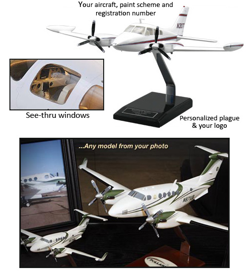 Have your airplane recreated into a beautiful desktop replica. No detail will be spared! Once you place your order you will receive an electronic order form that will guide you through the custom model ordering process. When ordering please be sure to tell us the type of airplane and the registration number. All plane models are shipped insured via UPS Air Freight and are backed with a 100% SATISFACTION GUARANTEE. IMPORTANT INFORMATION Please fill out the information form here in order to customize you model. Along with information form filled out, we also need 5 photos of the top, front, back, and both sides of your aircraft, email to: Info@AircraftSpruce.com |