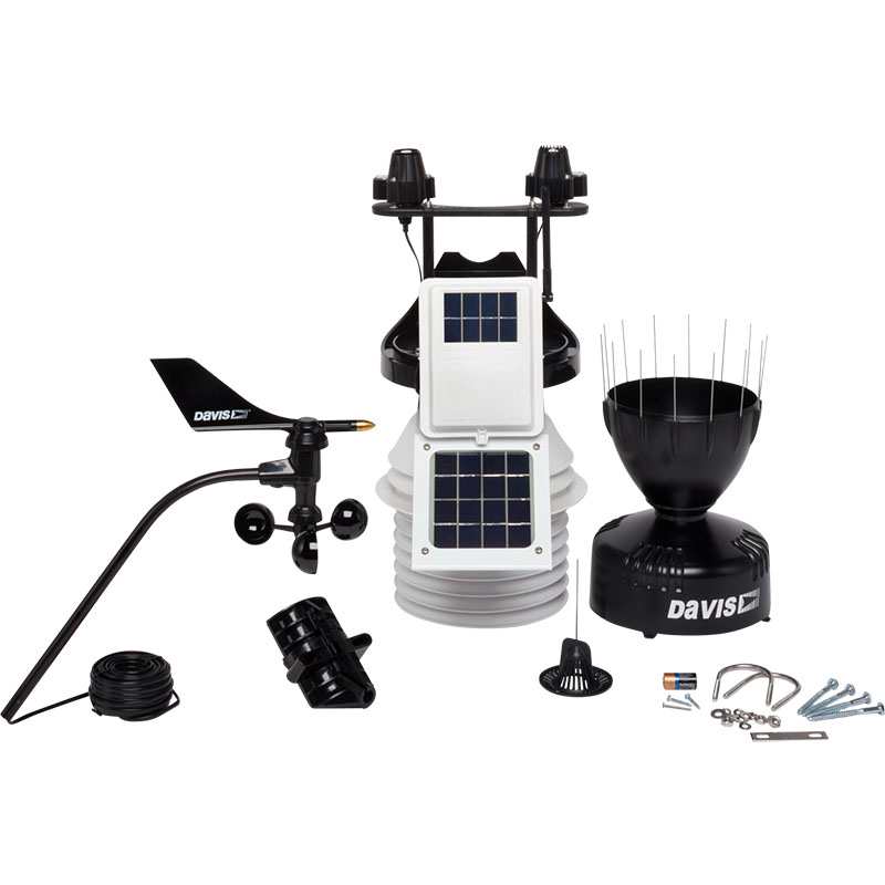 | The Davis Vantage Pro2 weather station is a research-grade weather station that provides professional-grade data for weather enthusiasts, researchers, growers, and weather professionals. It reports real-time wind speeds up to 200 mph, temperature and humidity, barometric pressure, rainfall and other information such as heat index, dew point, highs and lows, and much more. Users have the option to include solar and UV radiation sensors, as well as a fan-aspirated radiation shield. Vantage Pro2 sensors are NIST-traceable and are suitable for professional weather data reporting. |