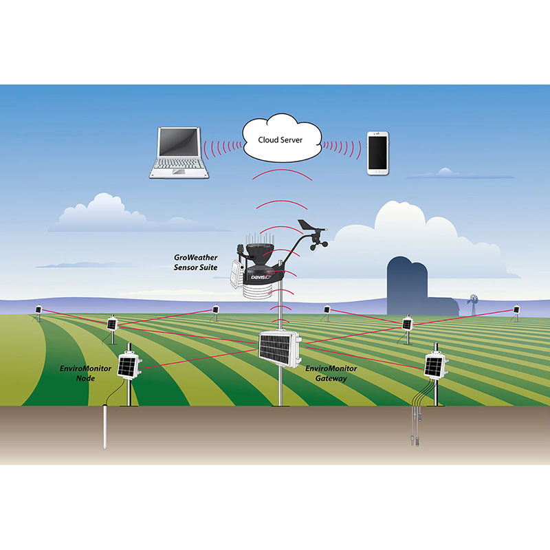 Davis Instruments is a leading maker of weather data collection solutions for agricultural production, research facilities, universities, schools, and weather hobbyists. The EnviroMonitor Node is an environmental and weather node that sends data from up to four sensors to an EnviroMonitor Gateway. You can create an array of sensors and collect data from microclimates and across production fields.