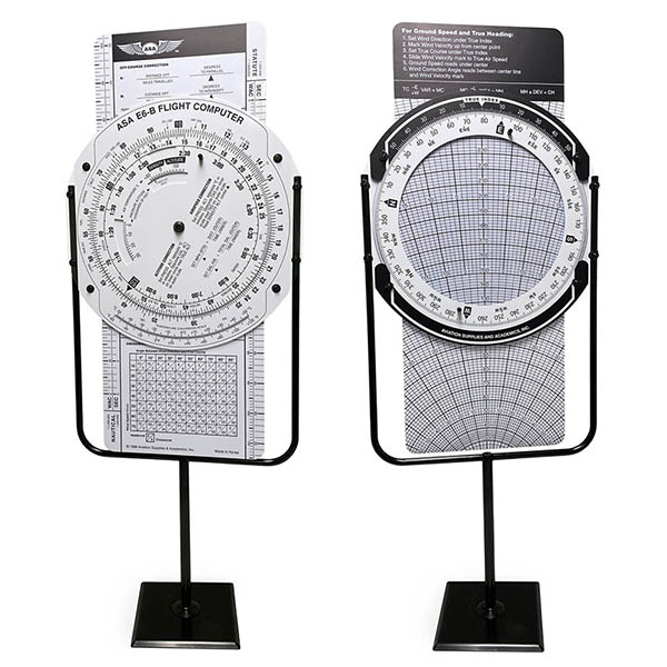 | Performing flight calculations is an essential skill every pilot must have. Fuel, distance, speed, time, angle, volume, arm, moment, capacity, duration, weight and balance are all numbers crucial to a flight plan. Teaching students how to perform calculations using an E6B can be challenging. The E6B Classroom Trainer from ASA makes teaching flight computer computation fun and easy. This large-scale, fully functional E6B flight computer is made of durable plastic and sets on a sturdy metal base. It functions exactly like a handheld flight computer featuring a wind component grid and comprehensive crosswind correction chart on one side, and on the other side the slide computes time, speed, distance, altitude, true airspeed, and density altitude problems as well as conversions. Wingnuts allow for tension adjustments on the slide rule. Large knobs on both sides allow for easy rotation of the azimuth for calculations. The wind side can be marked with a dry or wet erase marker. Nautical and statute scales are included. |