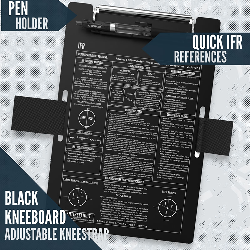 IFR Pilot Kneeboard And Flight Pad The IFR Pilot Kneeboard and Flight Pad set is designed for serious instrument pilots who demand structure and reliability in the cockpit. The kneeboard features a secure strap, durable surface, and quick-access clip, while the flight pad includes essential sections for clearances, ATIS, holds, approaches, and more, helping you stay organized under pressure. WHAT'S INCLUDED – One black aluminum IFR kneeboard with pen holder and adjustable strap (6 7/16" x 9 9/16"), plus a premium paper IFR notepad designed for in-flight use. CLEARANCE MADE EASY – Includes a pre-printed IFR notepad using the KRAFT format to simplify and speed up the process of copying IFR clearances. STAY SHARP IN-FLIGHT – The kneeboard features an integrated holding pattern entry tool to help you maintain focus and situational awareness while flying. THOUGHTFUL DESIGN – Smart layout allows space under the strap for a logbook or E6B. Built for real cockpit use—durable, compact, and practical. READY TO GIFT – Packaged in a sleek, sealed box, it makes a great gift for any pilot—whether they're training, flying the real thing, or honing skills in simulation. |