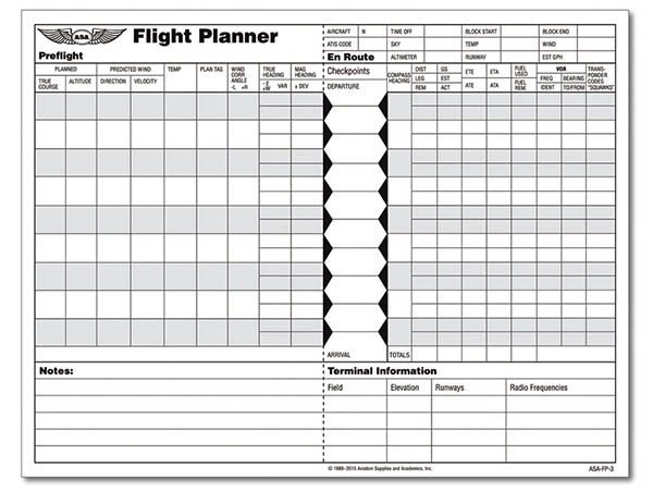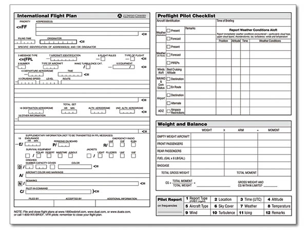 | Flight planning sheets contain all the information necessary for an efficient and safe flight whether domestic or international. 48 sheets per pad. Ideal for both domestic and international preflight planning and in-flight progress tracking. The front side of the flight planner sheets provide for input of preflight information such as planned course, altitude, predicted winds, en route checkpoints, compass headings, estimated times, fuel, navaid frequencies, and terminal information--- field elevation, runway information, and communication frequencies. The backside of the sheets include a preflight pilot checklist, weight and balance computation table, PIREP guidance, and the flight plan format used by the International Civil Aviation Organization (ICAO). On October 1, 2015, the FAA will implement flight plan filing for civil aircraft exclusively under the format used by the ICAO. Flight plans contain specific information relating to the proposed flight of an aircraft and controllers use them to provide air traffic services. Today pilots file flight plans in the U.S. under either the domestic or ICAO format. The use of one format will simplify the process and align U.S. flight plans with ICAO standards. |