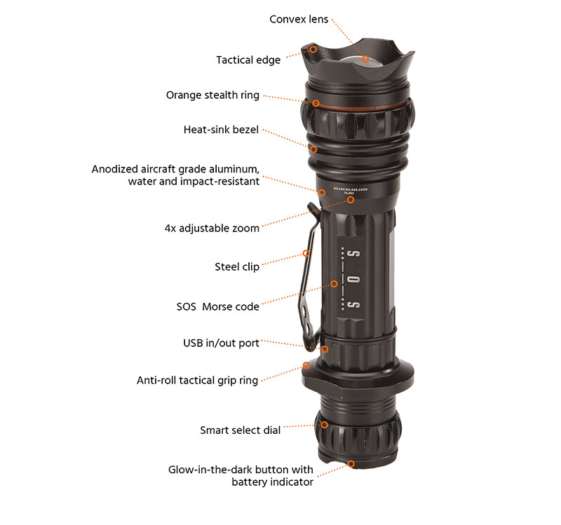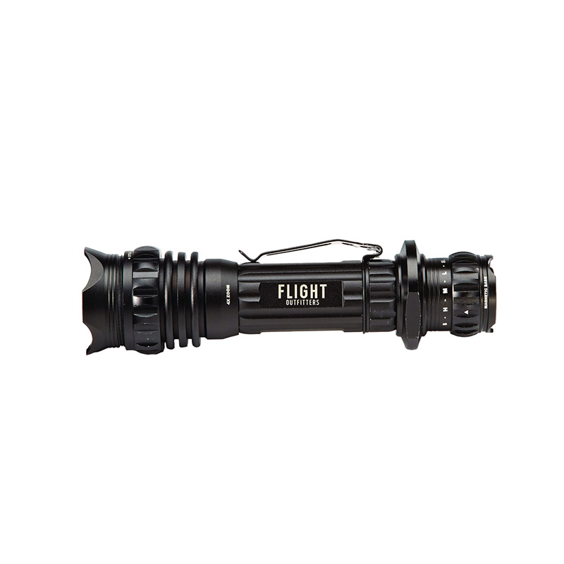 | Illuminate the night with this powerful, rechargeable flashlight. Smart Select Dial provides five unique light modes that can be accessed without scrolling through each one. Blast up to 1,000 lumens of white light for safe preflight inspections, or provide up to 120 hours of low-level green light so you don’t disturb sleeping passengers. An adjustable beam provides spot and flood light modes, and there’s even a strobe setting for emergency signaling. The Bush Pilot Flashlight is charged via a USB port, so you don’t have to worry about carrying AA batteries; it will recharge from your cigarette lighter, portable battery pack, or wall plug. Plus, the same charging port can provide output for keeping your phone at 100% (does not charge tablets). Constructed with aircraft-grade aluminum, the Bush Pilot Flashlight is water-resistant and tough enough to survive life in a bush pilot’s airplane. A magnetic base makes mounting to crew cars or luggage carts quick and easy—it’s perfect around the hangar. No flight bag is complete without this ultimate backup flashlight. |
