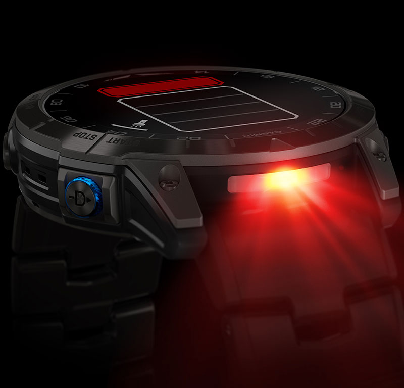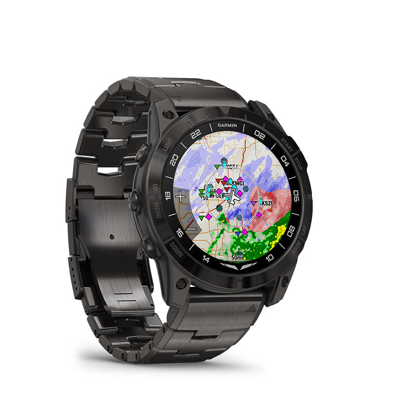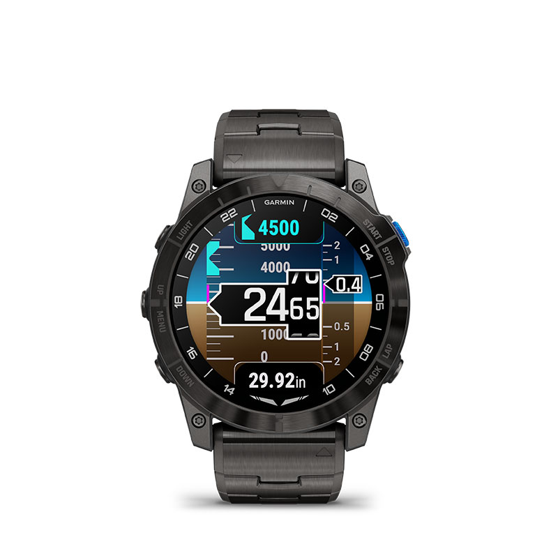 |  Be ready for takeoff, day or night. This premium smartwatch has a built-in flashlight, superbright AMOLED display and advanced tools for flying and fitness.     BUILT-IN FLASHLIGHT   EXTRA-LARGE DISPLAY   PREMIUM MATERIALS    DIRECT-TO NAVIGATION   MOVING MAP   WEATHER REPORTS   METEOGRAM FEATURE   HSI COURSE NEEDLE    PULSE OX SENSOR   AIRPORT INFORMATION   BAROMETRIC ALTIMETER    FLIGHT LOGGING   RED SHIFT MODE   EMERGENCY MODE   CONFIGURABLE ALERTS   ALERTS AND TIMERS   UTC AND TIME ZONES   FLIGHT PLAN TRANSFER   SUNRISE/SUNSET WIDGET   PLANESYNC™ TECHNOLOGY COMPATIBLE   JET LAG ADVISER    GARMIN ECG APP   BODY BATTERY™ ENERGY MONITORING   WRIST-BASED HEART RATE   STRESS TRACKING   SLEEP SCORE AND ADVANCED SLEEP MONITORING   HEALTH SNAPSHOT™ FEATURE   SPORTS APPS   ANIMATED WORKOUTS   PERFORMANCE METRICS    DAILY WORKOUT SUGGESTIONS   GARMIN COACH   REAL-TIME STAMINA    MULTI-GNSS SUPPORT   MULTI-BAND FREQUENCY SUPPORT   INREACH® DEVICE CONNECTIVITY   TACTICAL FEATURES   DUAL-GRID COORDINATES   RUGGED CONSTRUCTION   ABC SENSORS   OUTDOOR MAPS+   GOLF COURSES    SMART NOTIFICATIONS   MUSIC APPS   GARMIN PAY™ CONTACTLESS PAYMENTS   CONNECT IQ™ STORE   POWER MANAGER   BATTERY LIFE 1When paired with a compatible smartphone, with a data connection, and in range of BLUETOOTH® technology 2Available only in the U.S. 3This is not a medical device and is not intended for use in the diagnosis or monitoring of any medical condition; see Garmin.com/ataccuracy. Pulse Ox not available in all countries. 4The ECG app is only available on select Garmin smartwatches with the latest version of the Garmin Connect™ smartphone app and watch software The ECG app is not available in all regions; see Garmin.com/ECG for availability. The ECG app is not intended for use by people under 22 years old. With the ECG app, a compatible Garmin smartwatch is capable of generating an ECG similar to a single-lead electrocardiogram. 5Activity tracking accuracy 6Active satellite subscription required. Some jurisdictions regulate or prohibit the use of satellite communication devices. It is the responsibility of the user to know and follow all applicable laws in the jurisdictions where the device is intended to be used. SPOTIFY and the Spotify logo are among the registered trademarks of Spotify AB. Amazon Music and all related logos are trademarks of Amazon.com, Inc. or its affiliates. The Bluetooth word mark and logos are registered trademarks owned by Bluetooth SIG, Inc. and any use of such marks by Garmin is under license. |