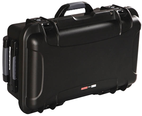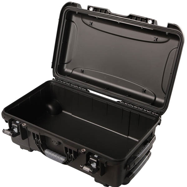 Black waterproof injection molded case pullout handle and inline wheels. Interior dimensions of 20.5" x 11.3" x 7.5".