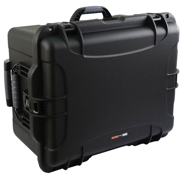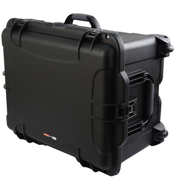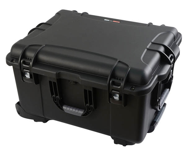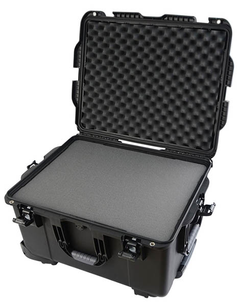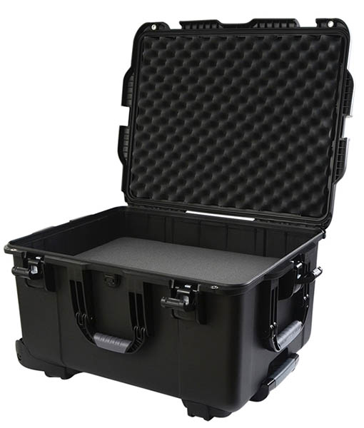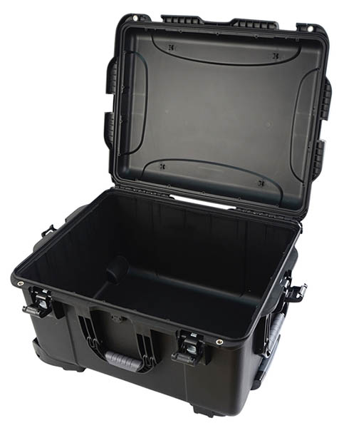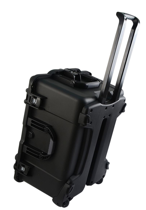 Black injection molded case with pullout handle and inline wheels. Interior dims 22" x 17" x 12.9".