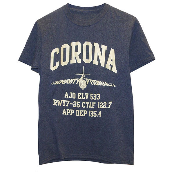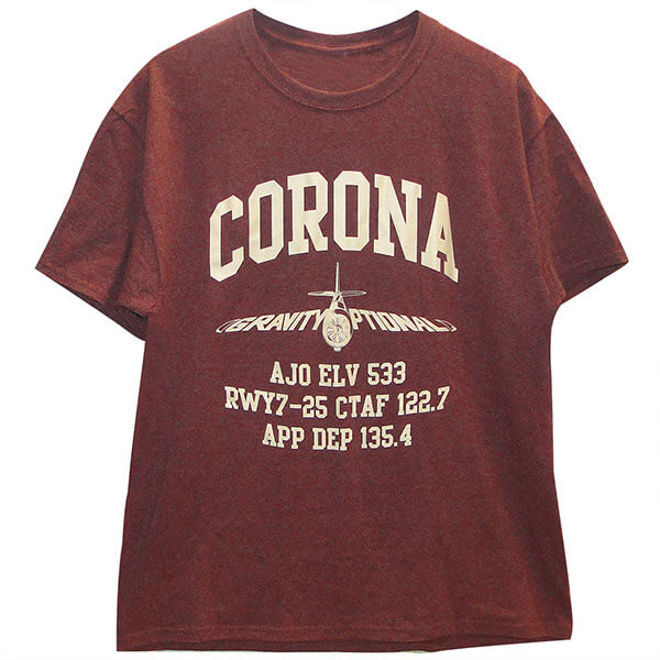 Corona Airport Gravity Optional T-Shirt. Available in Vintage Heather Blue or Maroon. Made from 50/50 Blend. (Polyester 50% Cotton 50%). |