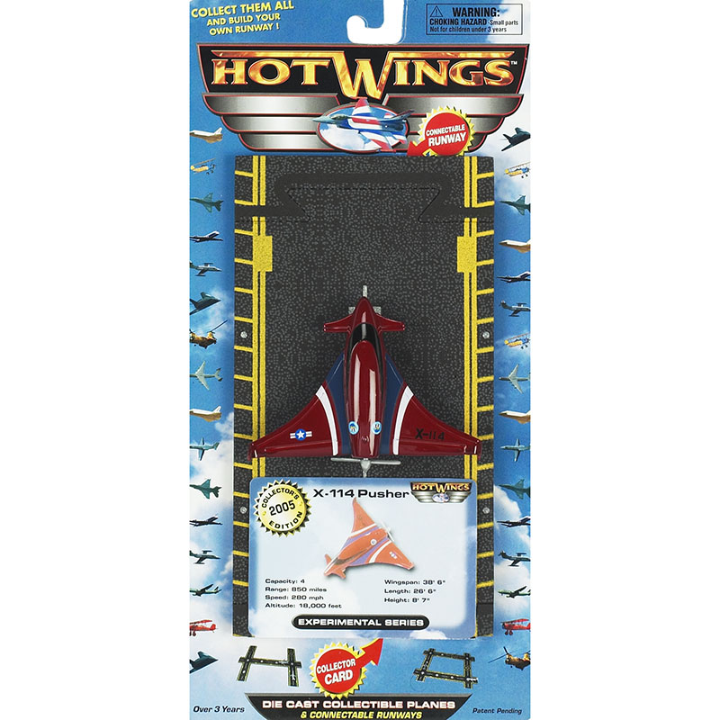 Hot Wings X-114 Pusher with connectable runway. Every Hot Wings plane comes with a collector card, plus proprietary connectible runway system that allows collectors to build their own runways and airports. Runways, taxiways and hangar accessories, make Hot Wings the most exciting collectible planes available. Seven distinct series, dating from the earliest Bi Planes to the newest Space Planes, offers something for every aviation enthusiast. Age: Over 3 years due to small parts. |