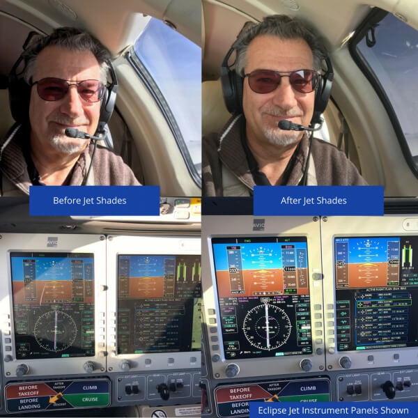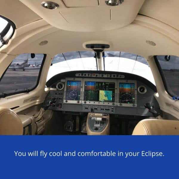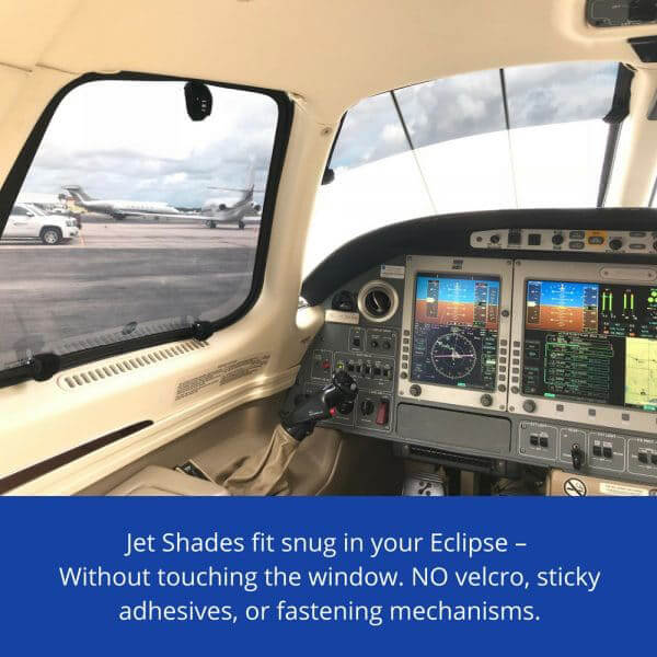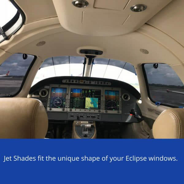 An Innovative Solution to Hot, Sunny, Eclipse 500/550 Cockpits. Unlike foil aircraft sun shades, Jet Shades are removable tinted window panels and visors designed to block harmful UV and sun glare in your aircraft cockpit both during flight and while parked!