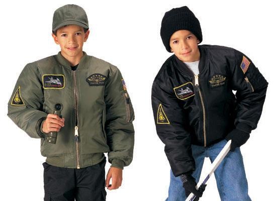 | With insignia patches this nylon, reversible orange lining, poly fiberfill linined childrens flight jackets is the way to go. |