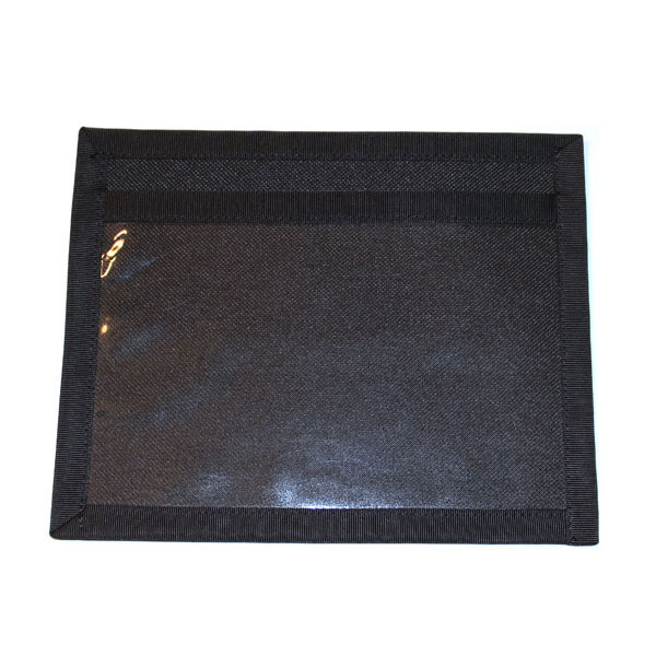 | 5" x 7" License holder made of 600 Denier, PVC backed, black nylon construction with a clear plastic window to display ownership certificates. |