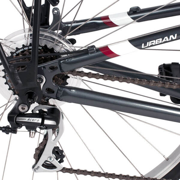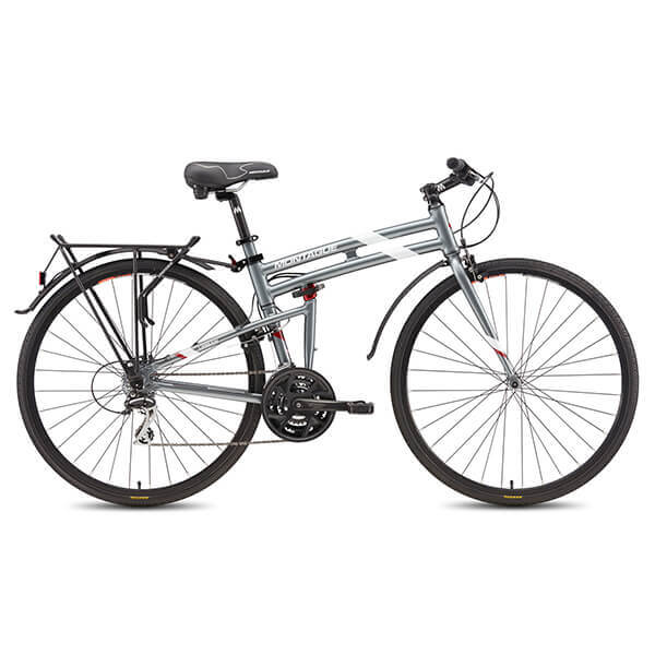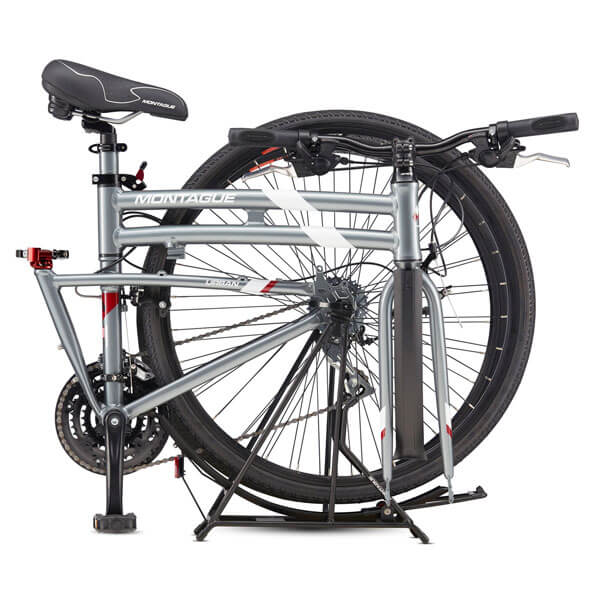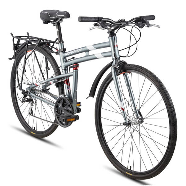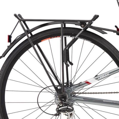 | The Urban is a folding bike with standard 700c wheels that delivers road performance on a budget. A 21-speed Shimano drivetrain provides ample gearing for hilly roads while wide 35mm tires cushion the ride over rough terrain and potholes. The patented RackStand offers cargo carrying capacity and has a built in fender, acts as a kickstand, and serves as a stand for the folded bike. |