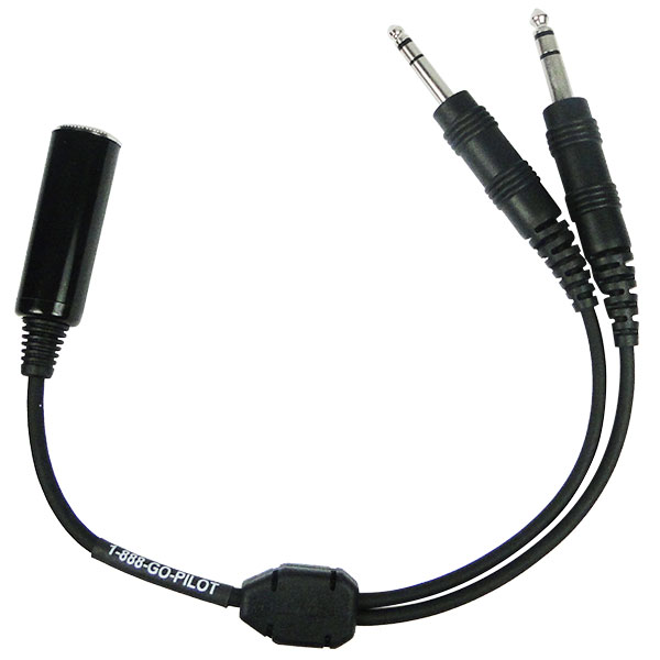 | 250-Inch Single Plug Headset to General Aviation (twin plug) Headset Adapter: This adapter converts a headset with a single .25" plug into one with two (standard .206 mic and .25" phone plugs). Cord is 9" inches in length. |