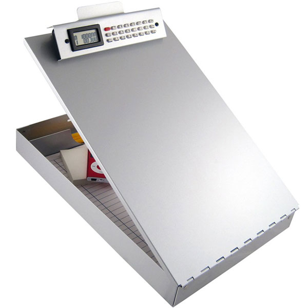 | This top opening pilot clipboard measures 9" x 14.5" and features a bottom storage compartment (1.5" deep) for charts, computers, checklists, pens, etc. Great for vertical or horizontal forms. Heavy duty aluminum construction with solid smooth writing surface. Furnished with battery powered calculator clip for in-flight calculations. |