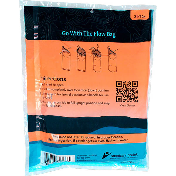 | The Go with the Flow Bag is specifically designed with super absorbent polymers and enzymes that instantly absorbs up to 20 ounces of urine. The ergonomically designed semi-rigid rim allows for easy, comfortable use by both men and women. Our proprietary one way valve also prevents spillage should the bag be dropped or mishandled. This bag uses our activated gelling agent to break down waste within the bag. |