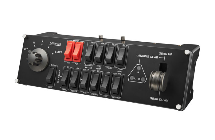 | Saitek's Professional Flight Switch Panel is ideal for expanding the number of controls in your flight simulator setup. Attach it to your Logitech G Flight Yoke, place it atop your desk, or even mount it to your own custom cockpit setup. Control your landing gear and lights, engine power and other important aircraft functions, all from one compact unit.
