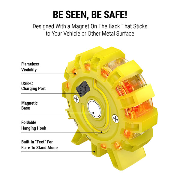 • A magnet on the back attaches the flare to your vehicle, or other metal surface. Also, includes foldable hanging hook and built-in “feet” for flare to stand alone.
