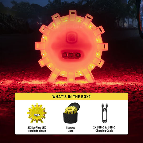 • Included: (2) SCOFLARE LED Roadside Flares, (2) USB-C to USB-C Charging Cables, Storage Case.
