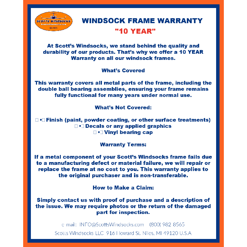 Engineered for strength and reliability. Scotts Windsocks Frames are built to withstand the toughest conditions. Featuring a premium welded steel double ball bearing construction. these frames ensure smooth, consistent rotation even in variable winds. Designed with durability in mind, they're crafted from high quality materials that resist wear & tear, providing unmatched performance for aviation, industrial and recreational applications.